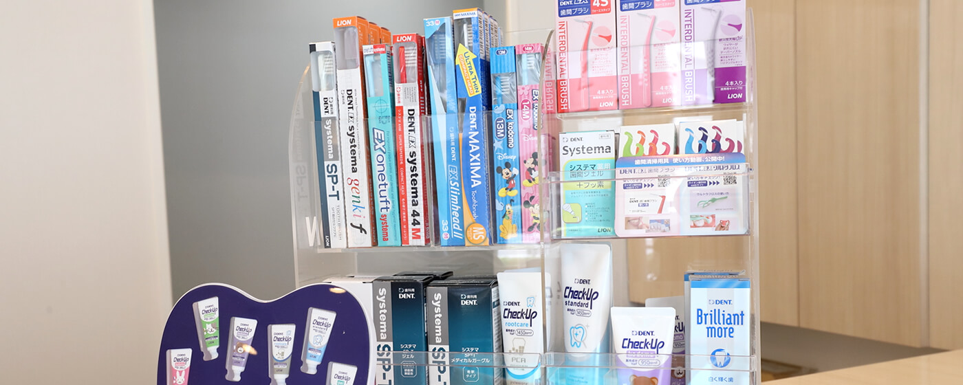 歯ブラシやうがい薬、デンタルフロス等、当院がご利用をお勧めしているデンタルケア用品を、受付にてご購入いただけます。